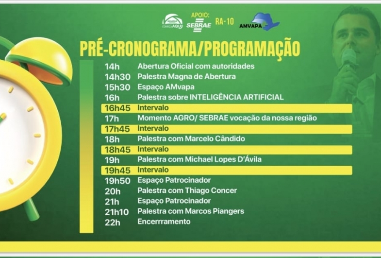 Entre os palestrantes confirmados estão Tiago Concer, especialista em vendas, atendimento e marketing, reconhecido nacionalmente por seu foco em resultados práticos e estratégias voltadas ao crescimento empresarial e Marcos Planger, jornalista, escritor e especialista em comportamento e inovação, conhecido por abordar temas relacionados à criatividade, ao futuro do trabalho e à relação entre tecnologia e humanidade.