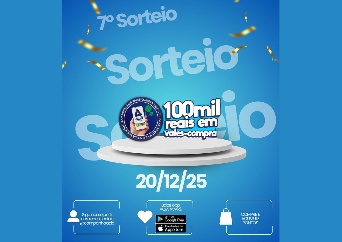 O 7º sorteio da campanha “A sorte na palma da sua mão” acontece neste sábado,20/12/2025