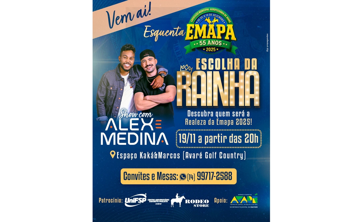 “Descubra quem será a realeza da EMAPA 2025”, destaca a organização. O evento tem início às 20 horas no Espaço Kaká & Marcos. O endereço é Rua Santo André, nº 96, Avaré Golf Country.