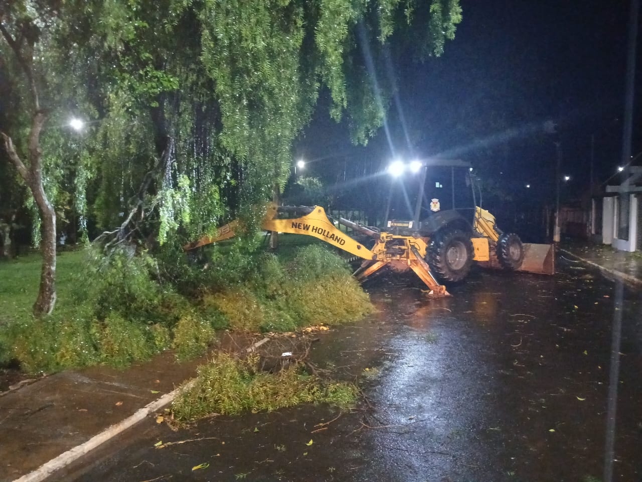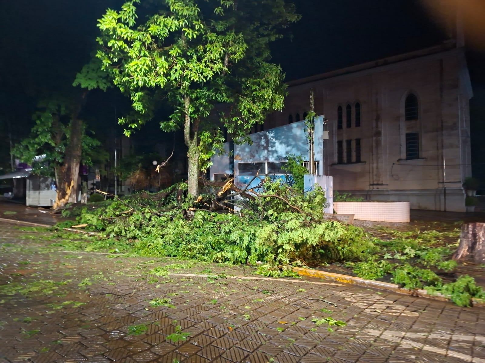 Ventos de até 100 km/h e chuva de 100 mm provocaram queda de árvores e danos em estruturas, mas não houve vítimas; equipes da Defesa Civil atuam desde a madrugada nos atendimentos.