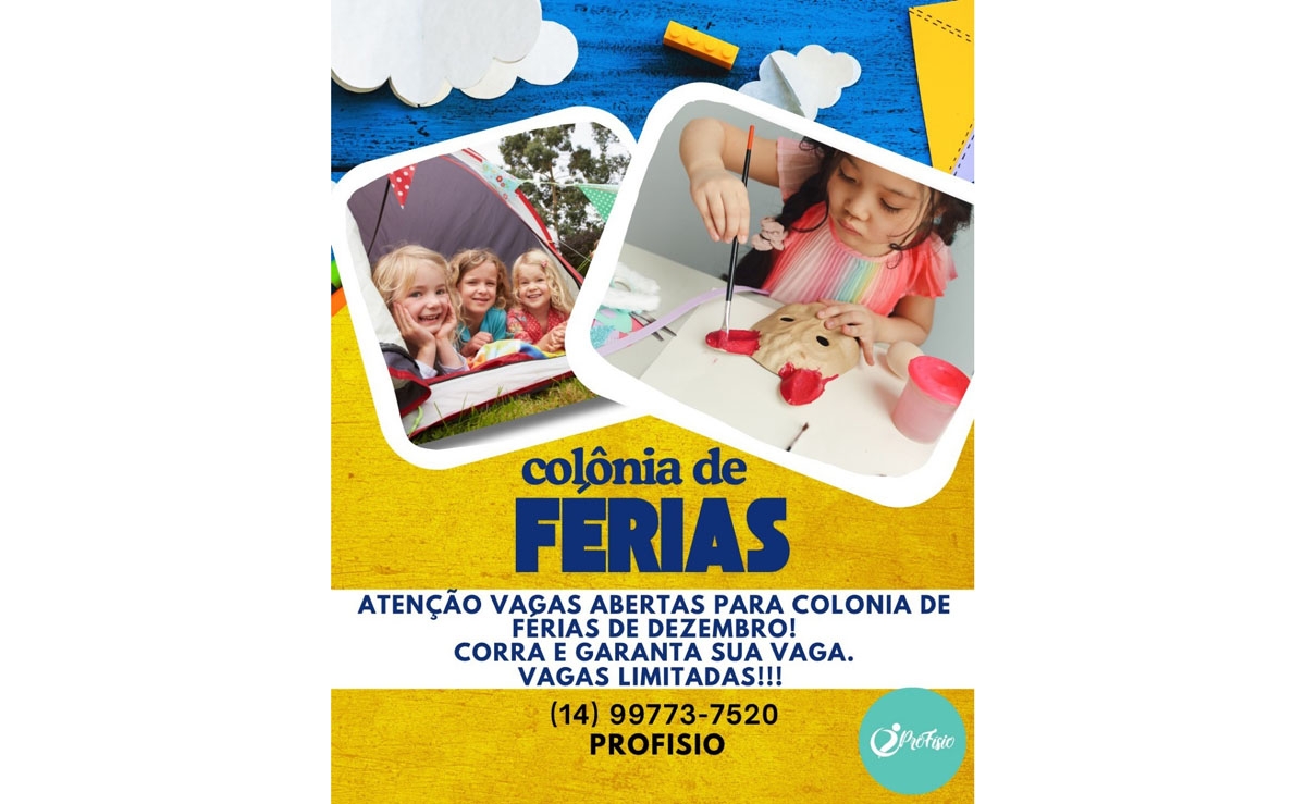 A PróFisio está com inscrições abertas para sua tradicional Colônia de Férias, que será realizada entre os dias 1º e 20 de dezembro. A programação especial foi preparada para garantir às crianças dias repletos de conhecimento, recreação, convivência e muita imaginação.