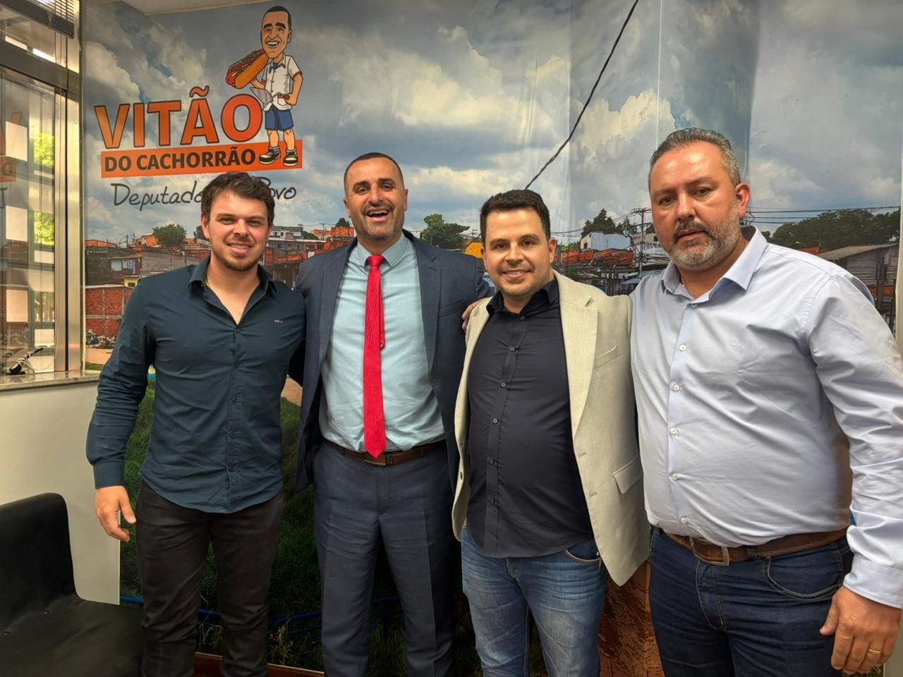 O prefeito de Coronel Macedo Diego do Nino, acompanhado do vice-prefeito Vinícius Tonon e do vereador Alessandro Português, esteve na tarde desta terça-feira (18) na Assembleia Legislativa do Estado de São Paulo (Alesp) para uma visita ao gabinete do deputado estadual Vitão do Cachorrão.