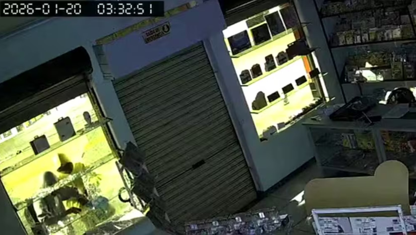 Nas imagens, os dois aparecem de mochila e caminhando em frente ao comércio. A vidraça da loja é quebrada com uma pedra e, em poucos segundos, a dupla furta pega os produtos que estavam na vitrine e foge.