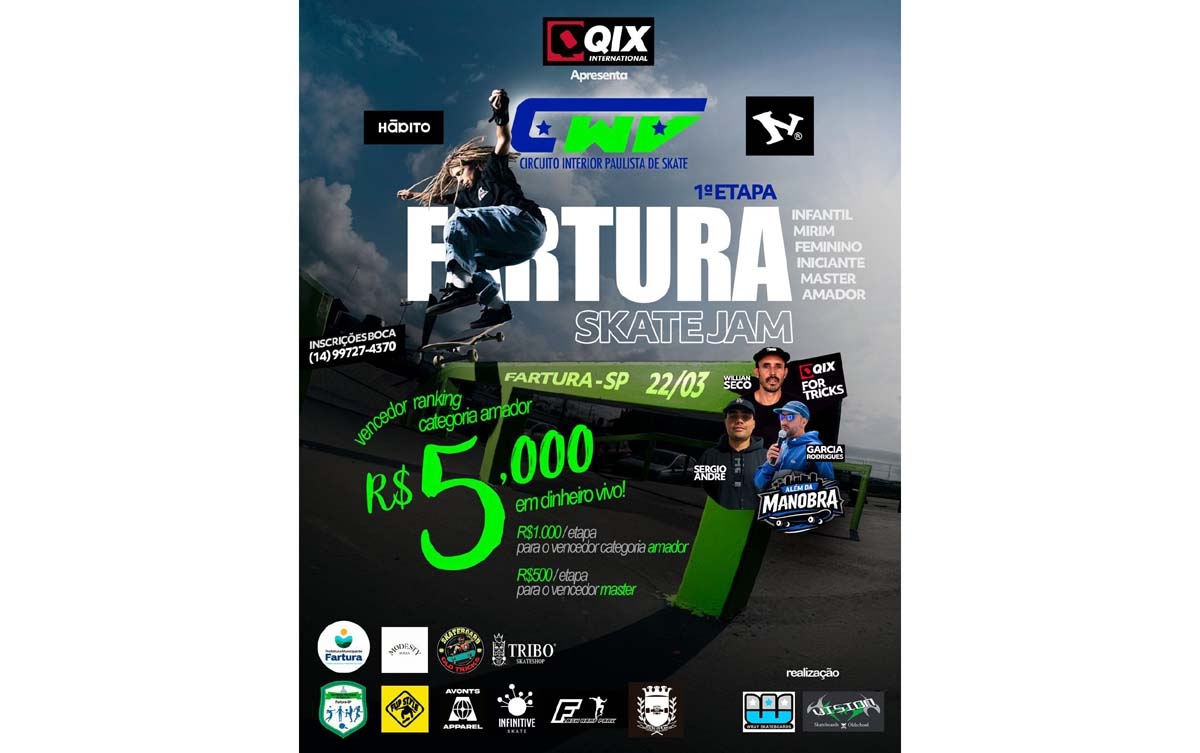 Aberto ao público, o Fartura Skate Jam busca incentivar a prática do skate, valorizar talentos locais e fortalecer o cenário do esporte na região. Mais informações também podem ser obtidas pelo telefone (14) 99727-4370.