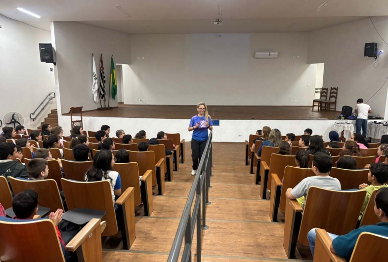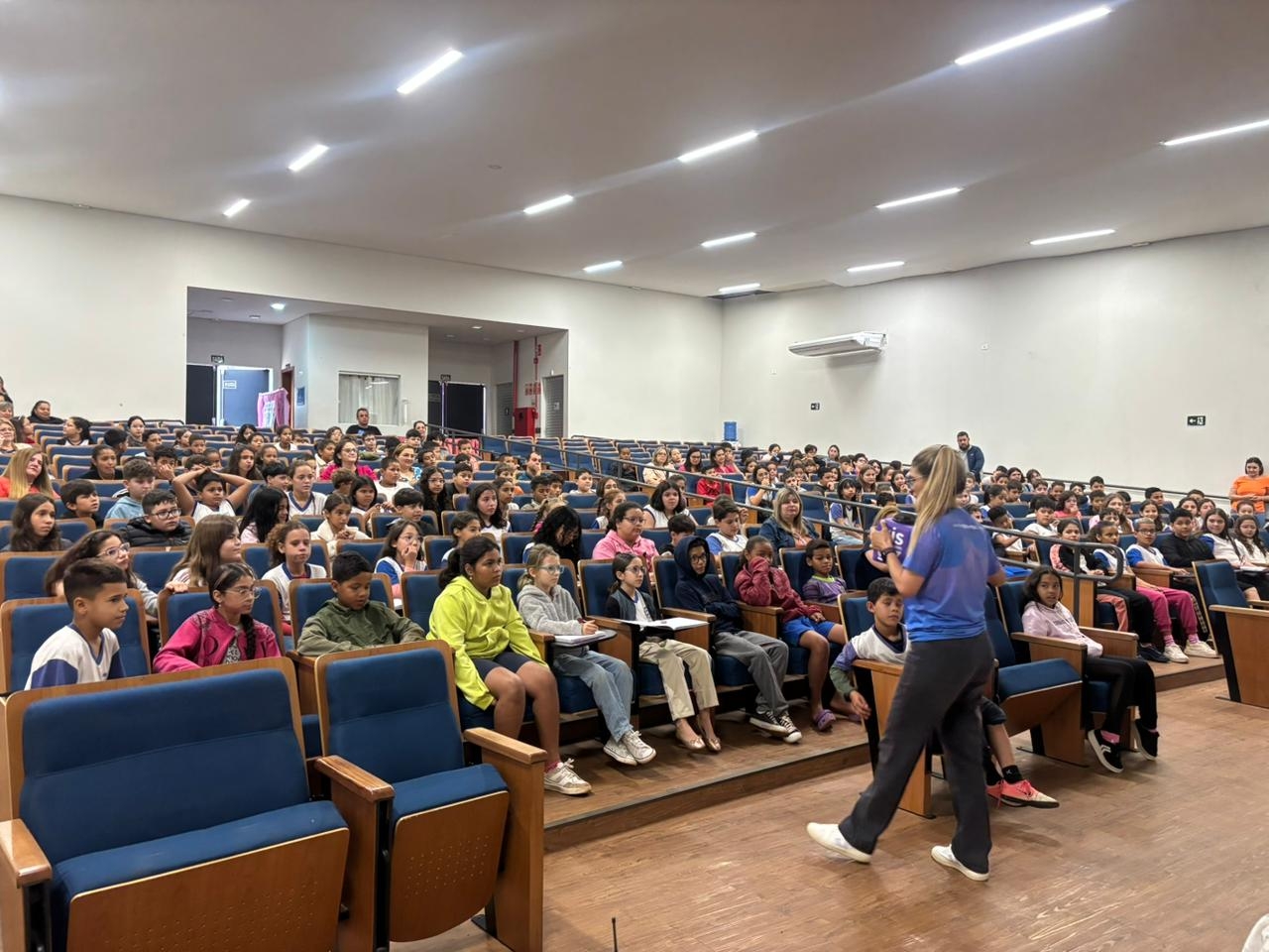 Na última quarta-feira (2), a professora e youtuber Gis com Giz, ministrou um aulão especial do Saeb para os alunos do 5º ano na EMEF Professor Miguel de Góes Vieira, em Fartura.