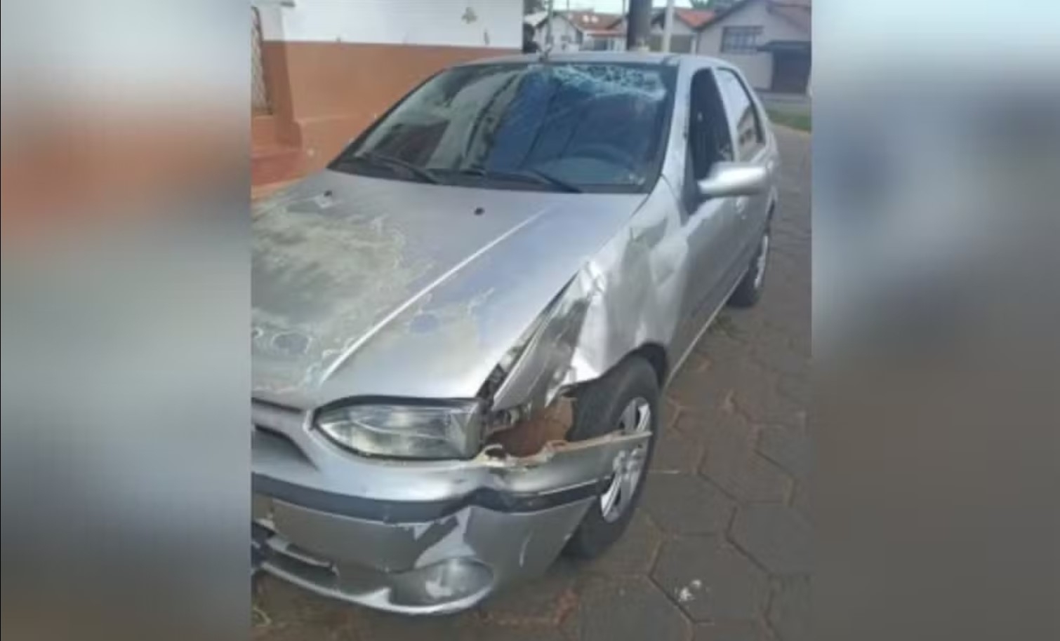 As imagens registradas por uma câmera de segurança mostram o momento em que o carro segue pela Rua Mato Grosso, passando pela sinalização de “pare” pintada no chão. Os dois veículos acabaram se encontrando e colidindo lateralmente, e o motociclista “voa” por cima do carro.