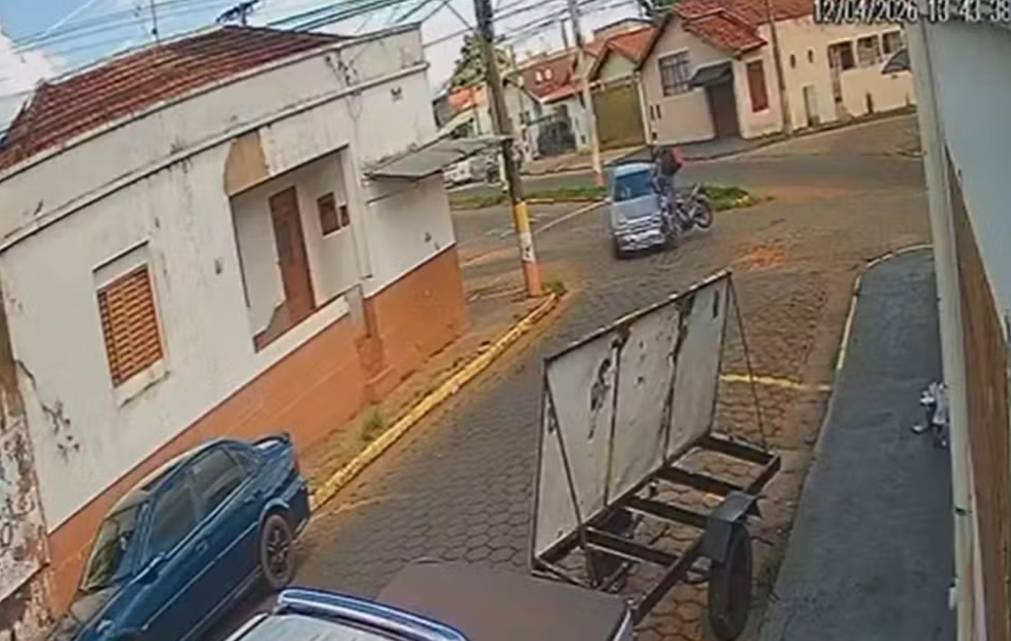 Uma câmera de segurança flagrou o momento em que um motociclista “voou” ao ser atingido por um carro no cruzamento da Avenida Paranapanema com a Rua Mato Grosso, em Avaré (SP), na tarde de domingo (12).