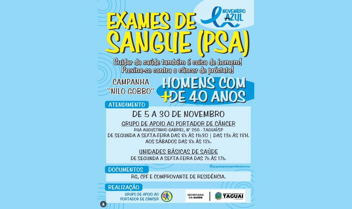 Participe da Campanha 'Nilo Gobbo' de Exames de Sangue (PSA), voltada para HOMENS COM + DE 40 ANOS.