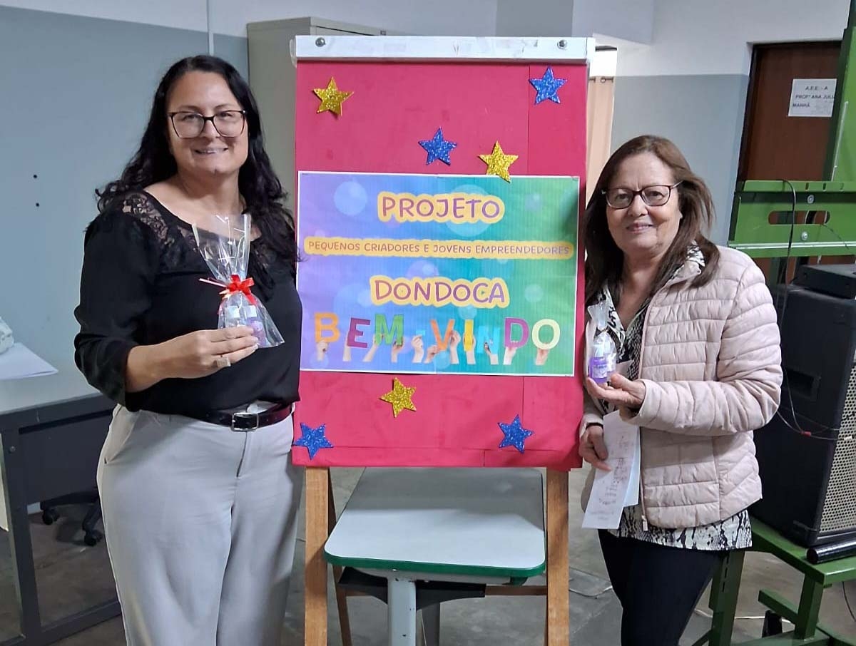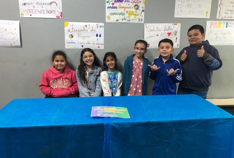 Uma feira escolar, na qual estudantes simbolicamente comercializaram produtos confeccionados em sala de aula, foi a etapa final do projeto “Pequenos Criadores e Jovens Empreendedores”.