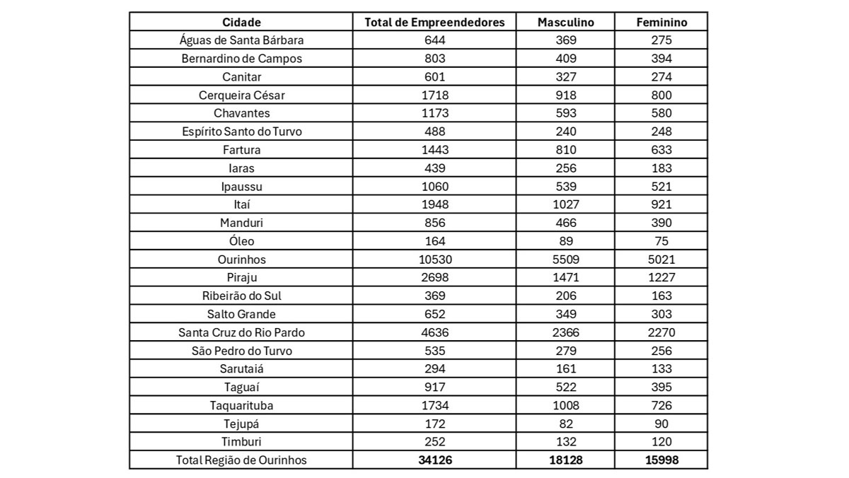 Na região, os municípios em que as mulheres ultrapassam o número de empreendedores homens são Espírito Santo do Turvo (248 mulheres e 240 homens) e Tejupá (90 mulheres e 82 homens).