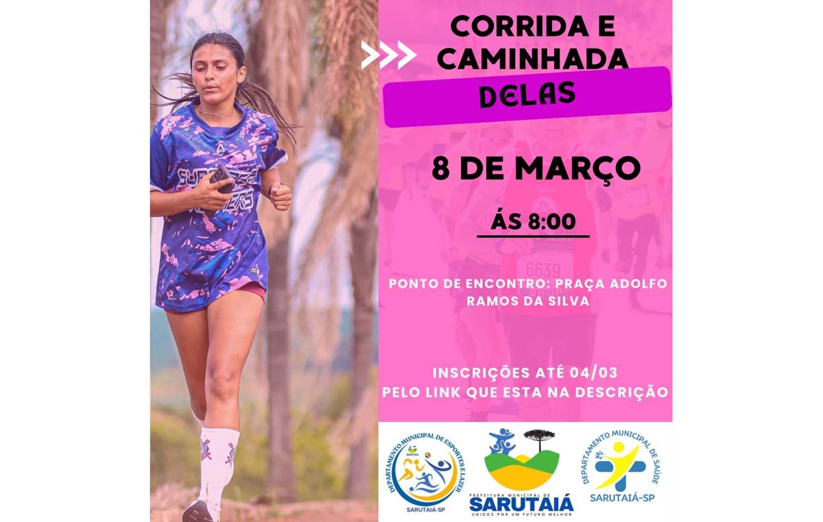 Em comemoração ao Dia Internacional da Mulher, celebrado em 8 de março, a Prefeitura de Sarutaiá realizará a Corrida e Caminhada Delas, evento voltado à promoção da saúde, do bem-estar e da valorização das mulheres do município.