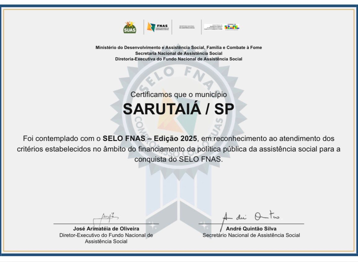 A Prefeitura de Sarutaiá tem a satisfação de anunciar uma importante conquista para o nosso município: a área de Assistência Social foi contemplada com o Selo FNAS.