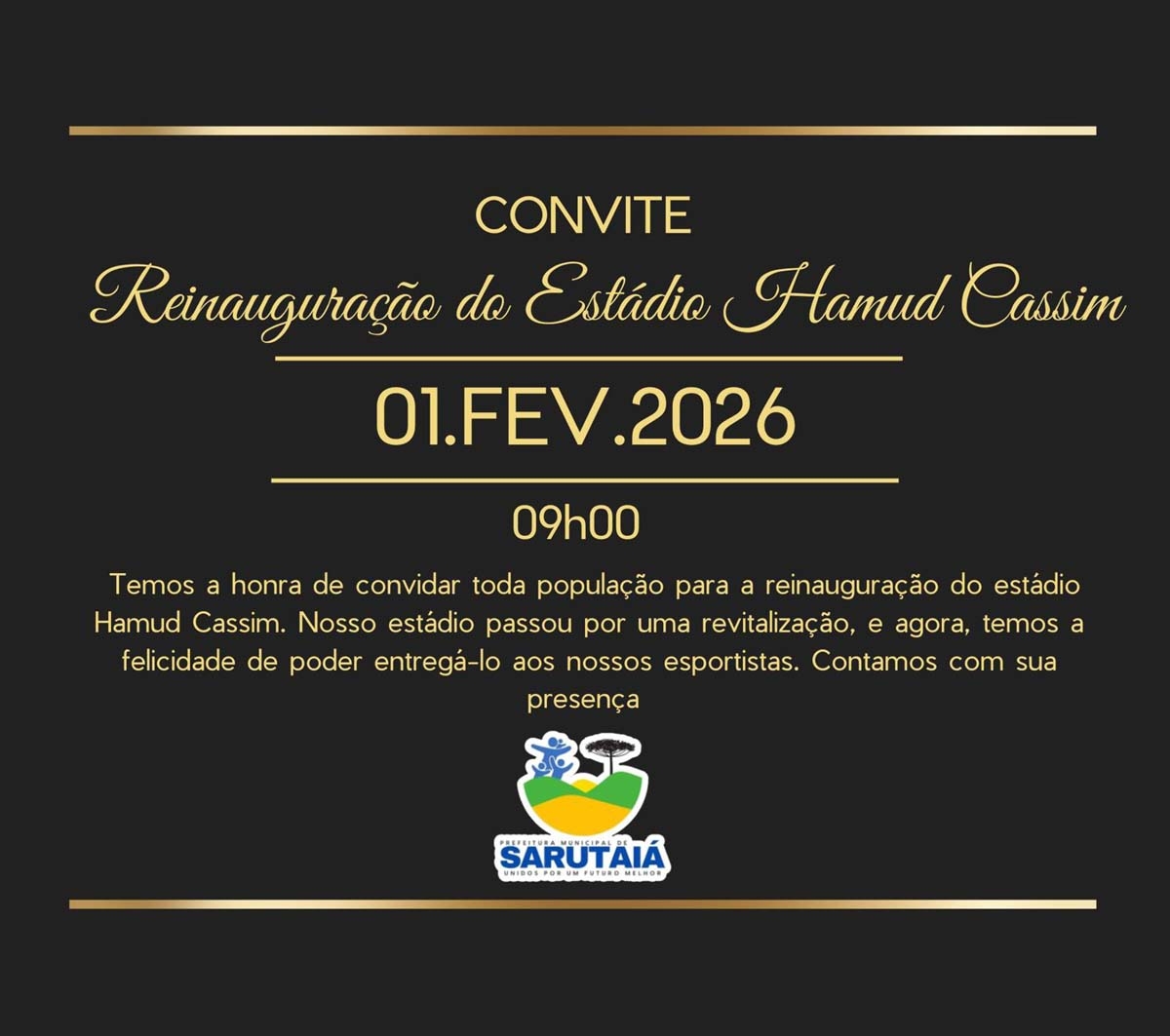 Neste domingo (1), Sarutaiá vive um momento especial para o esporte local com a reinauguração do Estádio Hamud Cassim. Após passar por um período fechado para a realização de revitalizações, o espaço esportivo será oficialmente reaberto ao público, oferecendo melhores condições para atletas, torcedores e toda a comunidade.