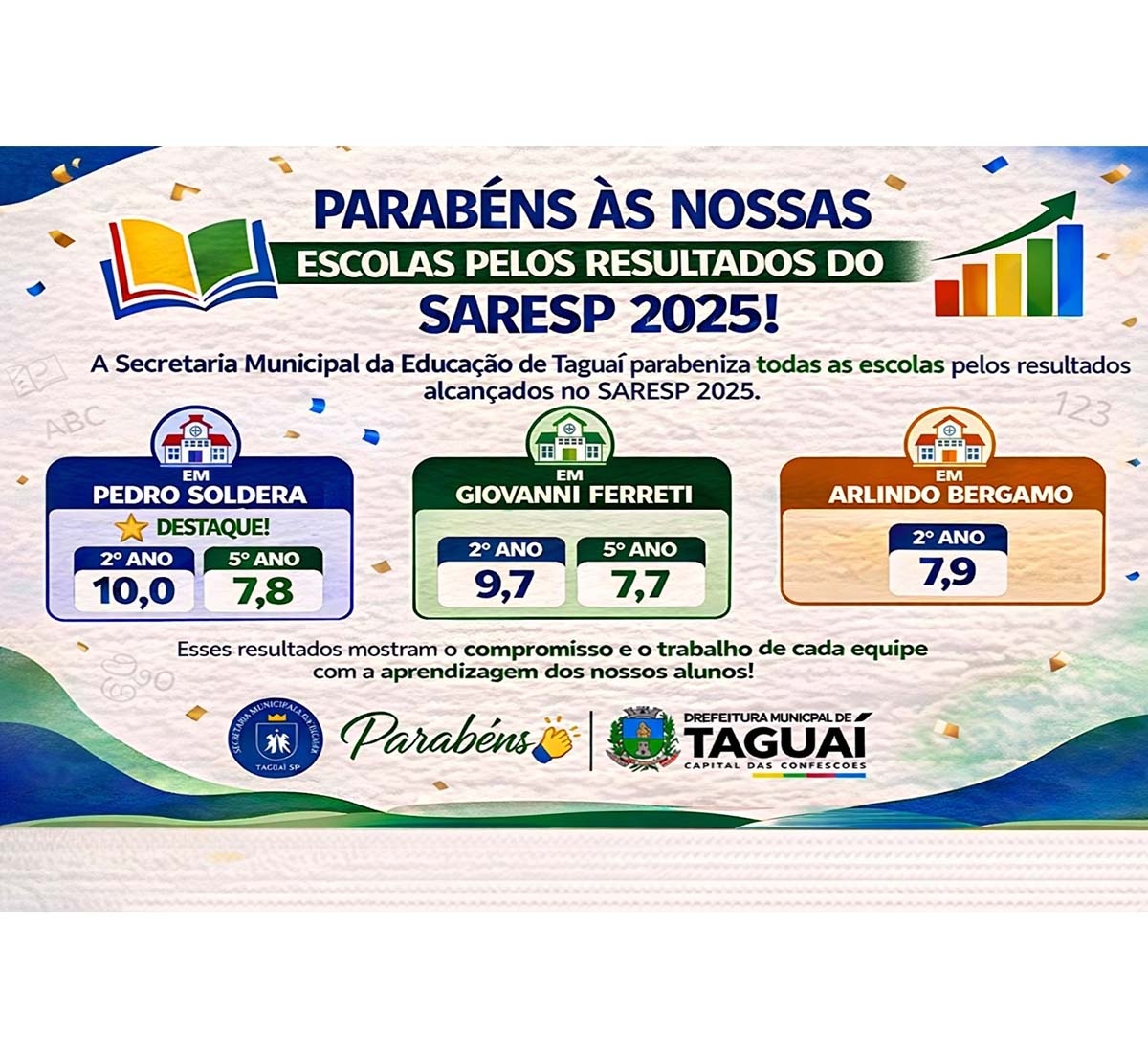 O município de Taguaí comemora os resultados obtidos no Saresp 2025, destacando o desempenho como fruto de um trabalho sério, comprometido e contínuo desenvolvido em toda a rede municipal de ensino.