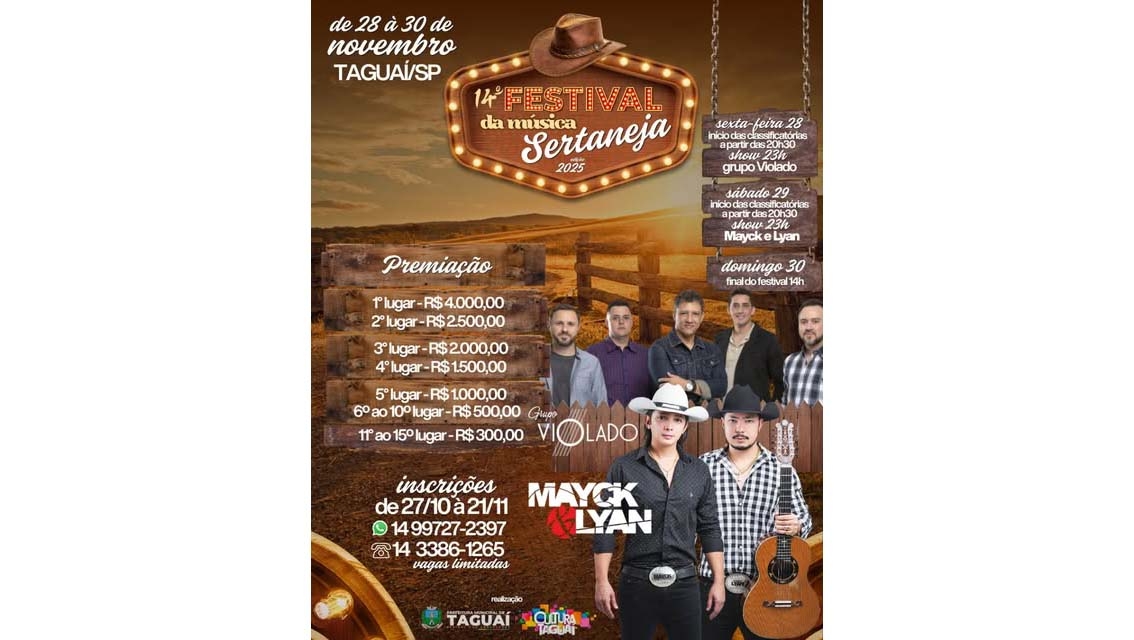 O município de Taguaí se prepara para sediar o 14º Festival da Música Sertaneja, que será realizado entre os dias 28 e 30 de novembro de 2025. O evento, que já se tornou tradição na região, promete reunir artistas e admiradores da música raiz em três dias de competição, cultura e entretenimento.