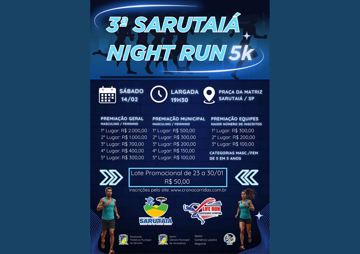 No dia 14 de fevereiro (sábado), Sarutaiá vai receber mais uma grande edição da Sarutaiá Night Run 5K, evento que abre oficialmente o calendário de festividades do aniversário da nossa cidade!