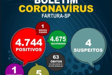 A Coordenadoria de Saúde de Fartura divulgou novo boletim epidemiológico nesta quinta-feira, 28 de abril. Mais 12 casos foram confirmados pela Pasta, sendo resultados de testes rápidos realizados nos postos de Saúde.