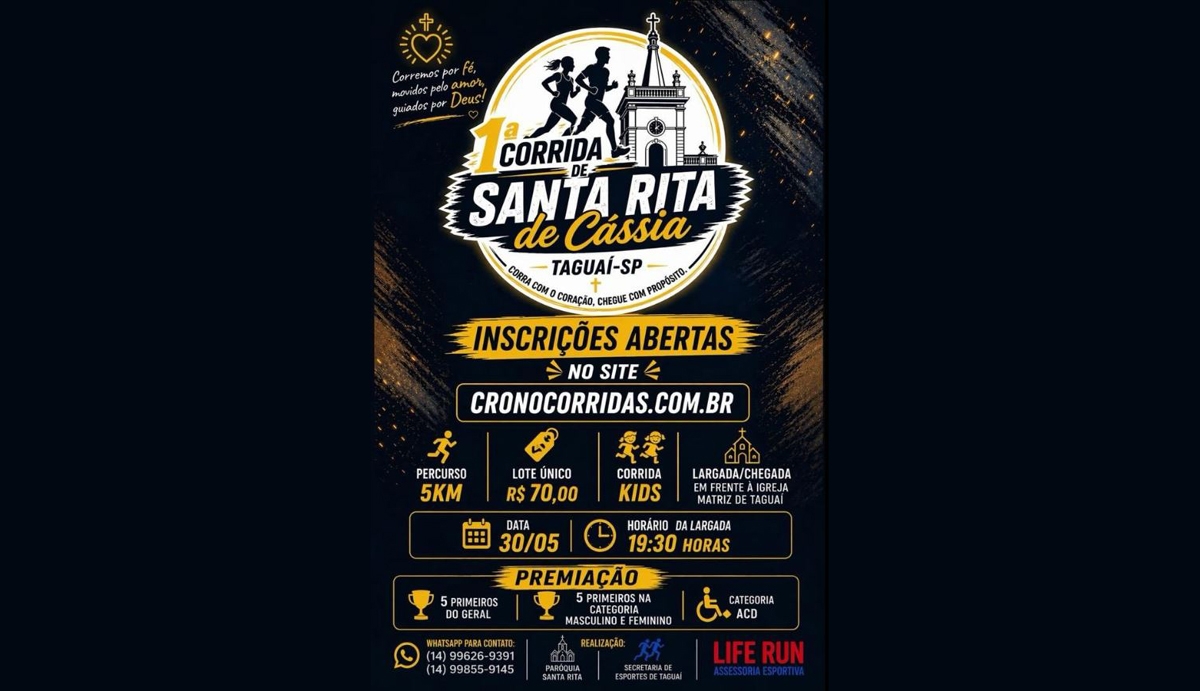Taguaí se prepara para receber a 1ª Corrida de Santa Rita de Cássia, evento esportivo que promete reunir atletas da cidade e de toda a região no dia 30 de maio, com largada às 19h30, em frente à Igreja Matriz de Taguaí.