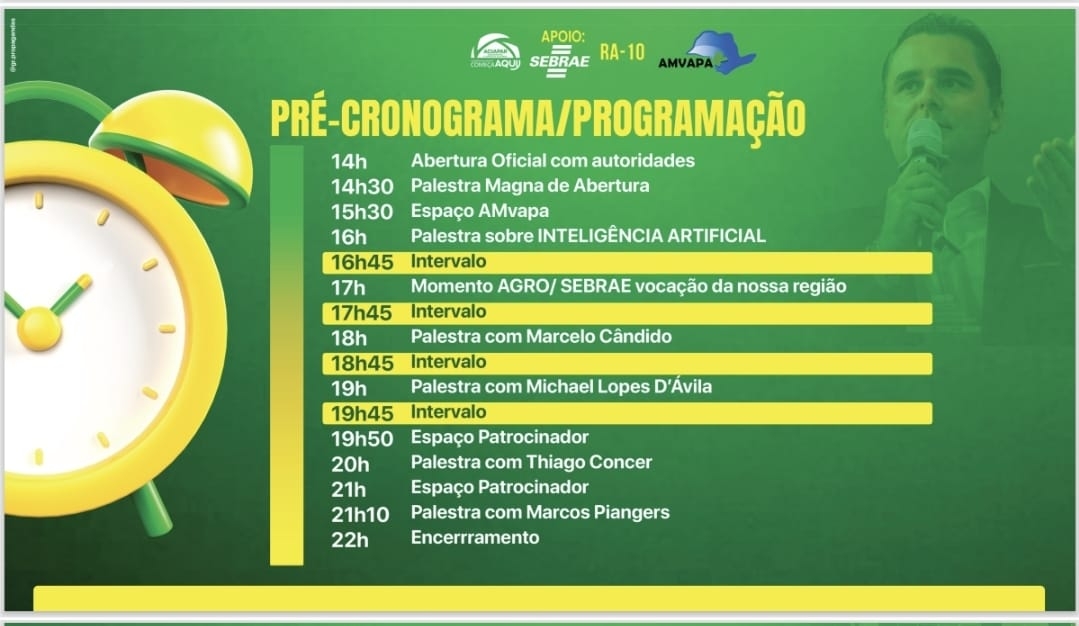 Entre os palestrantes confirmados estão Tiago Concer, especialista em vendas, atendimento e marketing, reconhecido nacionalmente por seu foco em resultados práticos e estratégias voltadas ao crescimento empresarial e Marcos Planger, jornalista, escritor e especialista em comportamento e inovação, conhecido por abordar temas relacionados à criatividade, ao futuro do trabalho e à relação entre tecnologia e humanidade.