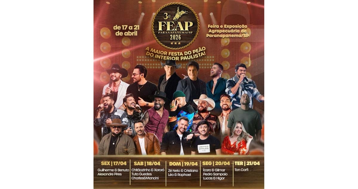 A cidade de Paranapanema irá curtir a partir desta sexta-feira (17) à 3ª edição da Feap (Feira e Exposição Agropecuária de Paranapanema), evento que já se consolida como uma das maiores festas da região e do interior paulista. A festança segue até o dia 21 de abril, reunindo grandes atrações musicais, rodeio e a valorização das tradições do agronegócio.