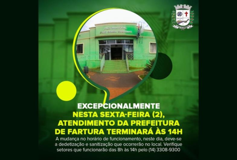 A Prefeitura de Fartura informa que os atendimentos ao público no Paço Municipal acontecerão das 8h às 14h. A orientação é para que os munícipes que precisarem se deslocar até o prédio da Prefeitura na data, para que façam neste horário. As demais coordenadorias funcionarão normalmente, até as 17h.