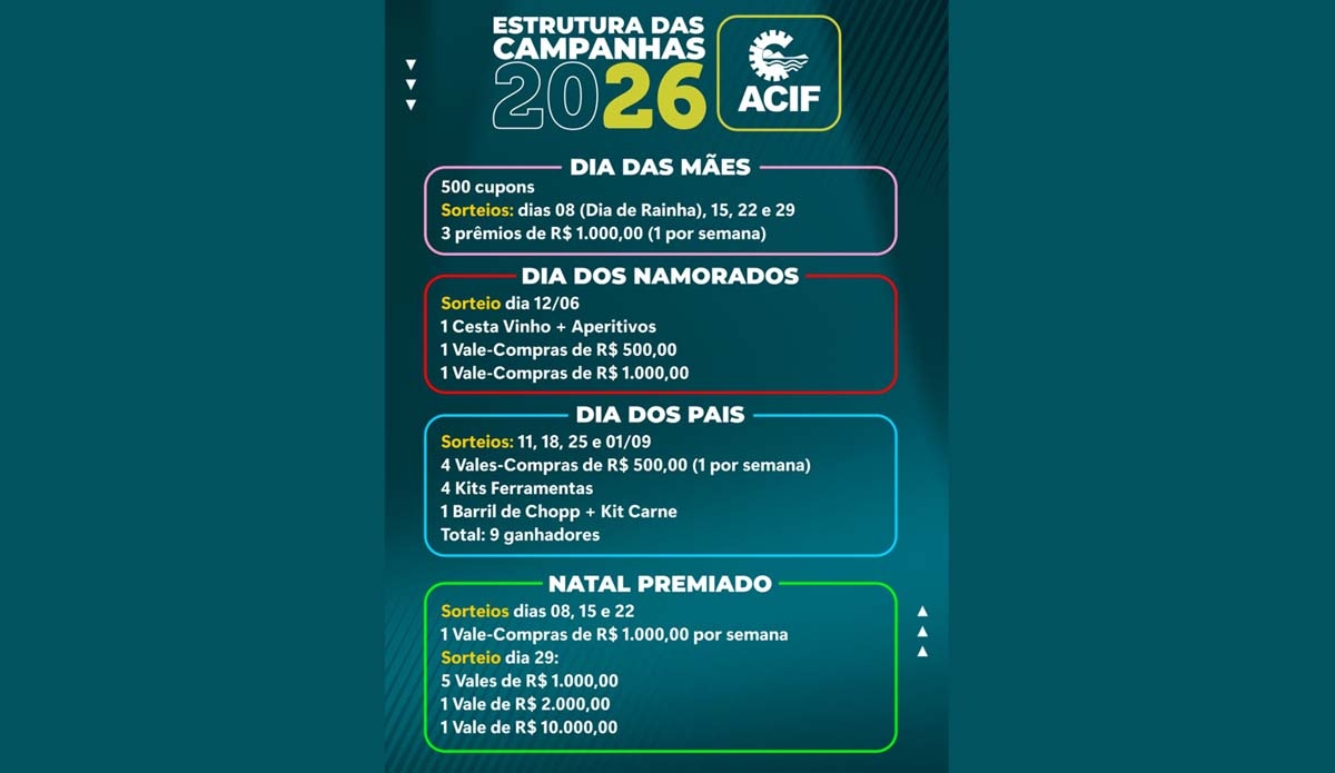 A Associação Comercial e Industrial de Fartura (Acif) lançou oficialmente a Campanha Anual 2026, trazendo uma grande oportunidade para empresários impulsionarem suas vendas, conquistarem novos clientes e fortalecerem o comércio local. A iniciativa reúne uma série de ações promocionais ao longo do ano, com sorteios e prêmios que prometem movimentar consumidores e lojistas.
