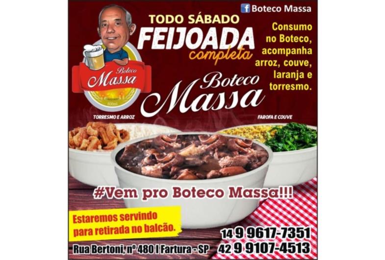 FEIJOADA - A partir deste sábado (22), o Boteco Massa estará servindo a tradicional Feijoada todos os sábados. Feijoada completa, acompanhada de arroz, farofa, vinagrete, couve, laranja e um delicioso torresmo.