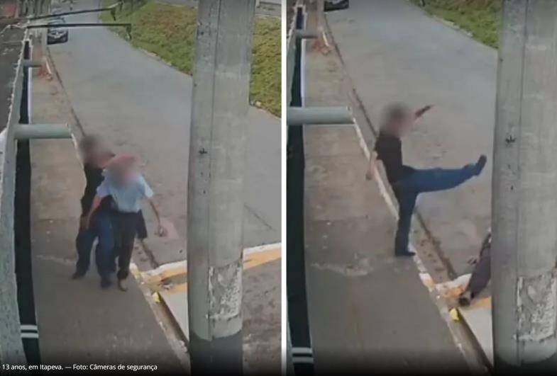 Imagens de câmeras de segurança registraram o momento em que o jovem, segurando o idoso pelo pescoço, desfere socos contra o homem, que acaba caindo na rua.