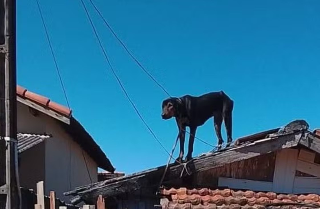 Um cão em situação de maus-tratos foi flagrado com uma corda amarrada no pescoço e enroscado perto da fiação elétrica no telhado de uma casa em Cerqueira César (SP). O animal foi resgatado na manhã desta quarta-feira (26) e levado a um abrigo.