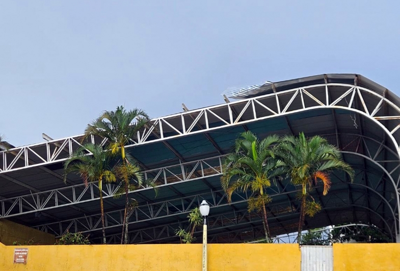 Nas imagens é possível ver a estrutura do barracão cedendo e o telhado levantando com a força do vento.