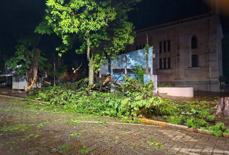 Ventos de até 100 km/h e chuva de 100 mm provocaram queda de árvores e danos em estruturas, mas não houve vítimas; equipes da Defesa Civil atuam desde a madrugada nos atendimentos.