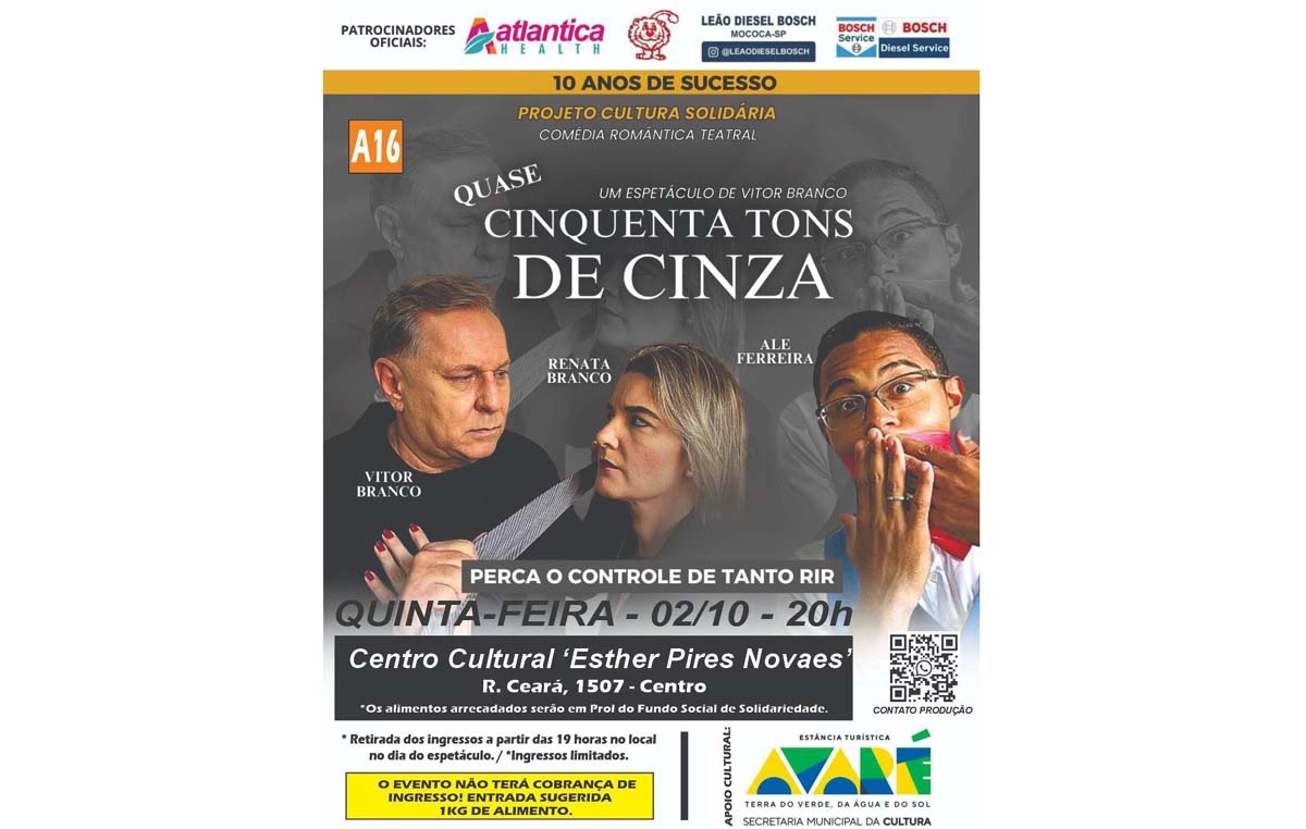 O Centro Cultural fica na Rua Ceará, nº 1507. A peça Quase Cinquenta Tons de Cinza tem patrocínio oficial da Atlantica Health, Leão Diesel Bosch e Bosch Service.