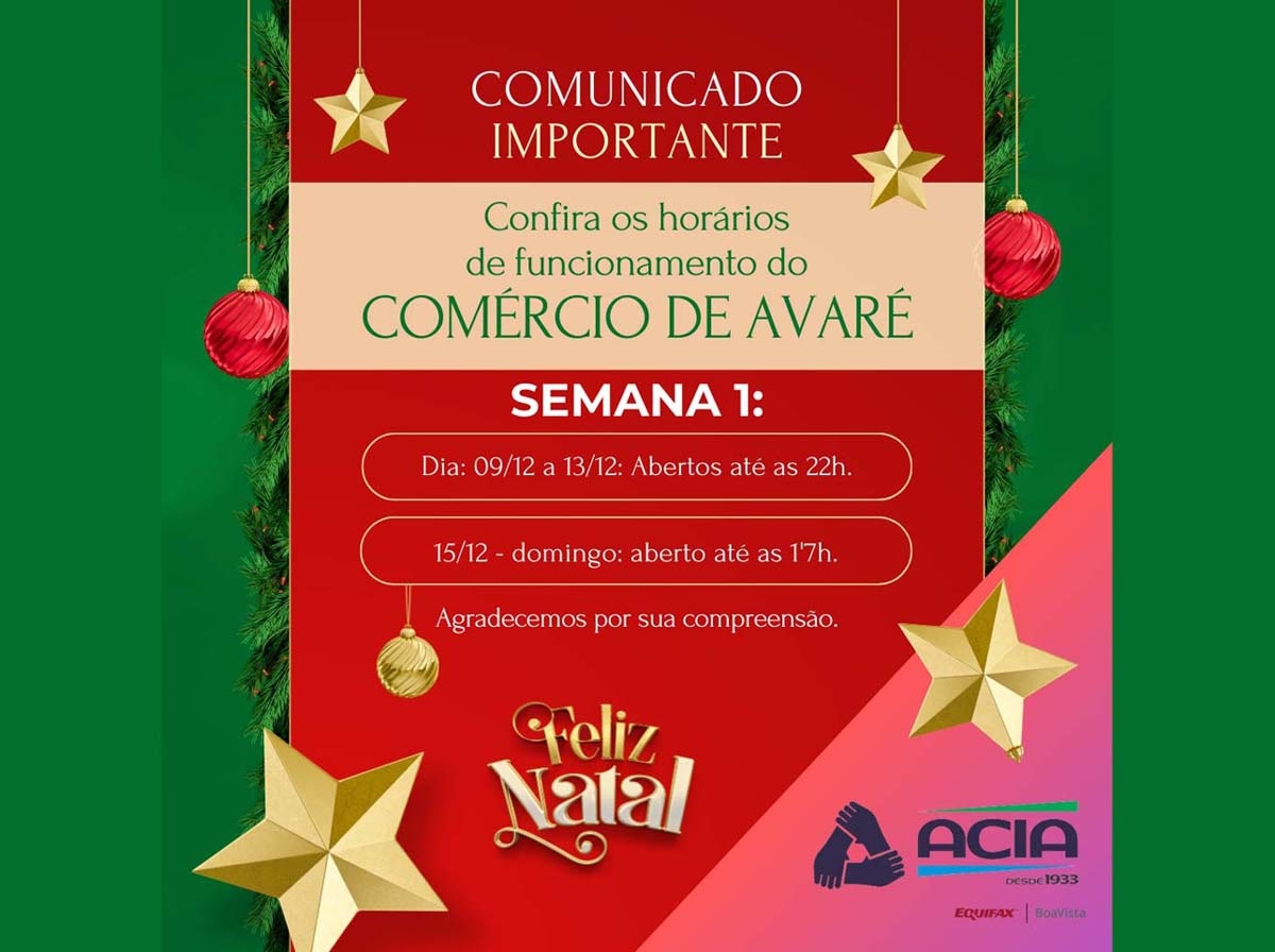 Na primeira samana do dia 9/12 até o dia 13/12, estarão abertos até as 22h. Já no dia 15/12, estarão abertos até as 17h