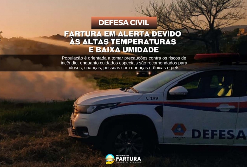 A Defesa Civil de Fartura emitiu um alerta à população devido às altas temperaturas e à baixa umidade relativa do ar que prevalecerão na região até o próximo domingo, dia 24 de setembro. A medida visa conscientizar a comunidade sobre os riscos associados a essas condições climáticas extremas e fornecer orientações essenciais para enfrentar esse cenário desafiador.