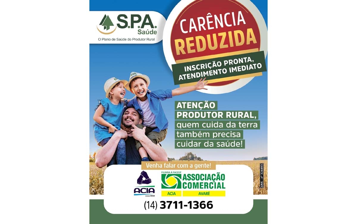 No âmbito local, a Acia de Avaré anunciou uma campanha de carência reduzida do S.P.A. Saúde, voltada especialmente ao produtor rural. A iniciativa busca facilitar o acesso ao plano de saúde, garantindo mais proteção, segurança e bem-estar para os associados e suas famílias.