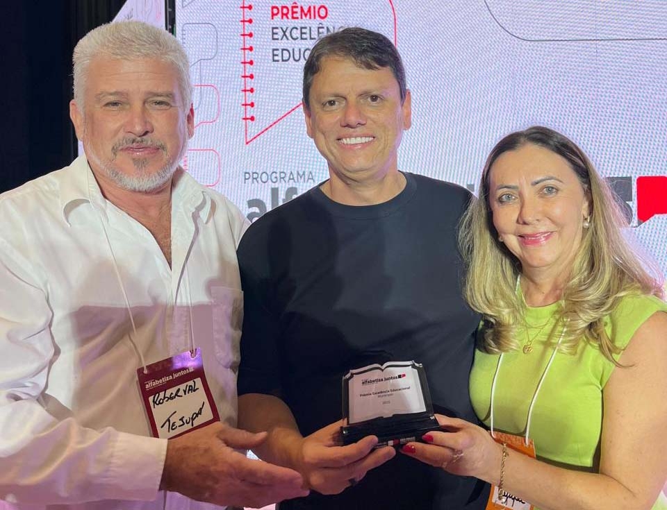 O prefeito Roberval Oliveira e a secretária Municipal de Educação Maria Vilma foram homenageados com o Prêmio de Excelência Educacional, entregue pelo governador Tarcísio de Freitas, em reconhecimento aos expressivos resultados alcançados pela rede municipal de ensino.
