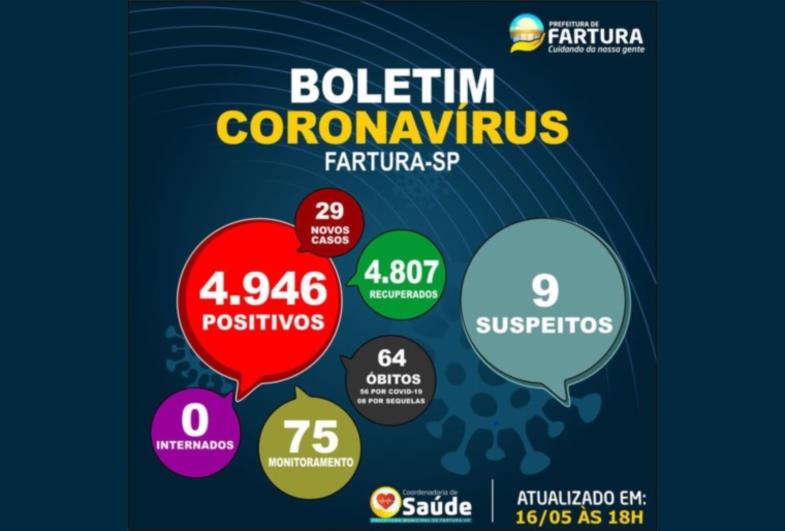 A Coordenadoria de Saúde de Fartura informou novo boletim epidemiológico desta segunda-feira, 16 de maio. Por meio de testes nos postos de Saúde, foram confirmados mais 29 casos de Covid-19.