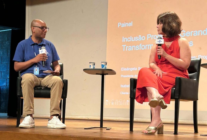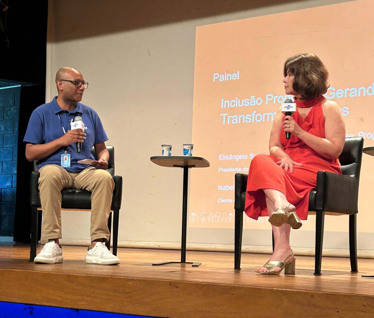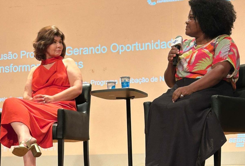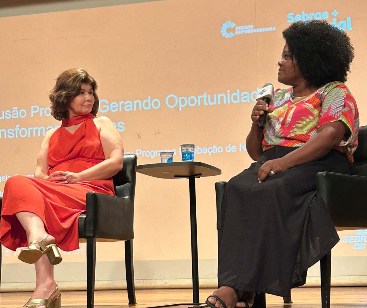 A presidente do Fundo Social de Fartura, Elisângela Souza, falou sobre as ações realizadas no município e a importância delas para o desenvolvimento local. Ao lado dela, a empresária Bel Marcondes deu um depoimento sobre os cursos do Sebrae-SP, destacando como foram importantes para o crescimento do seu negócio.