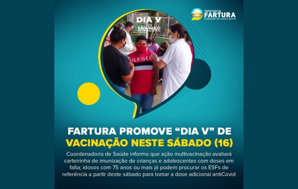 A Coordenadoria de Saúde de Fartura promoverá neste sábado (16), o “Dia V” de vacinação, para atualização da carteirinha de crianças e adolescentes que integram tanto a campanha contra o coronavírus quanto a de multivacinação. Neste mesmo dia, haverá também a aplicação da dose adicional contra a Covid-19 em idosos com mais de 75 anos de idade, que reforça a imunidade contra o vírus. É fundamental que este público já esteja vacinado com a segunda dose ou dose única há seis meses.