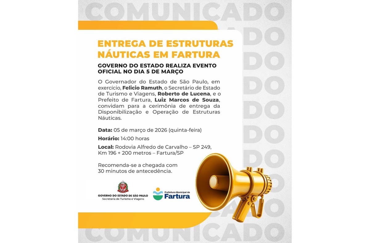 No dia 5 de março, às 14h, será realizada a cerimônia oficial de entrega das Estruturas Náuticas, com a presença de autoridades estaduais e municipais.
