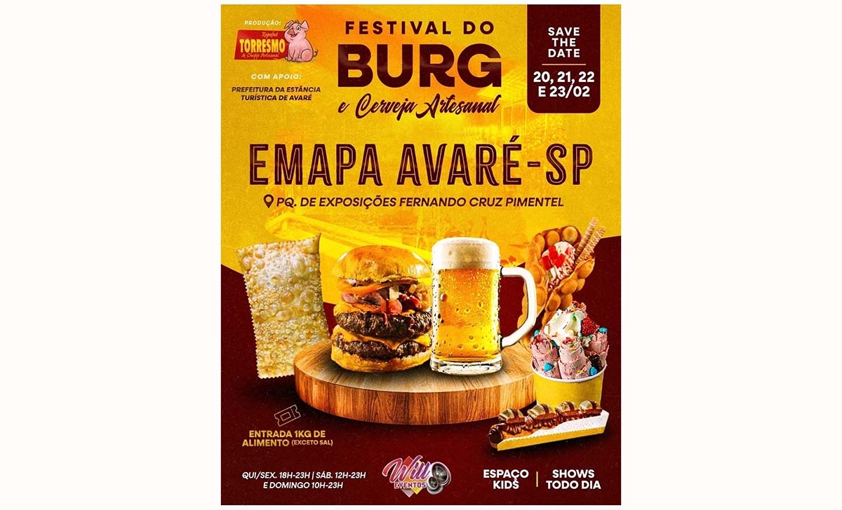 A realização é da Expo Torresmo & Chopp Artesanal com apoio da Prefeitura de Avaré, por meio da Secretaria Municipal de Cultura e Secretaria Municipal de Turismo. Confira abaixo a programação completa.
