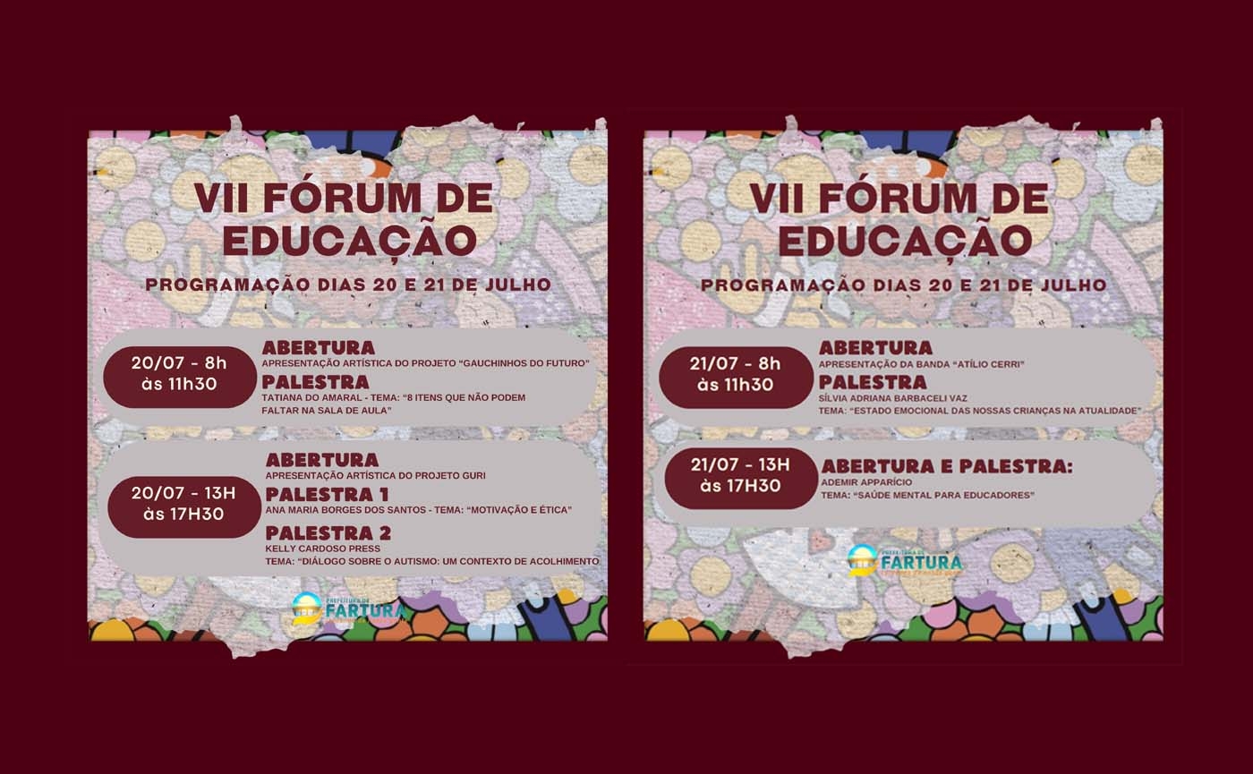 Nos dias 20 e 21 de julho, Fartura realizará o VII Fórum Municipal da Educação. O evento reunirá professores, colaboradores e especialistas da área para discutir questões fundamentais relacionadas à educação e promover o aprimoramento profissional. A ação é marcada pela participação de renomados palestrantes.