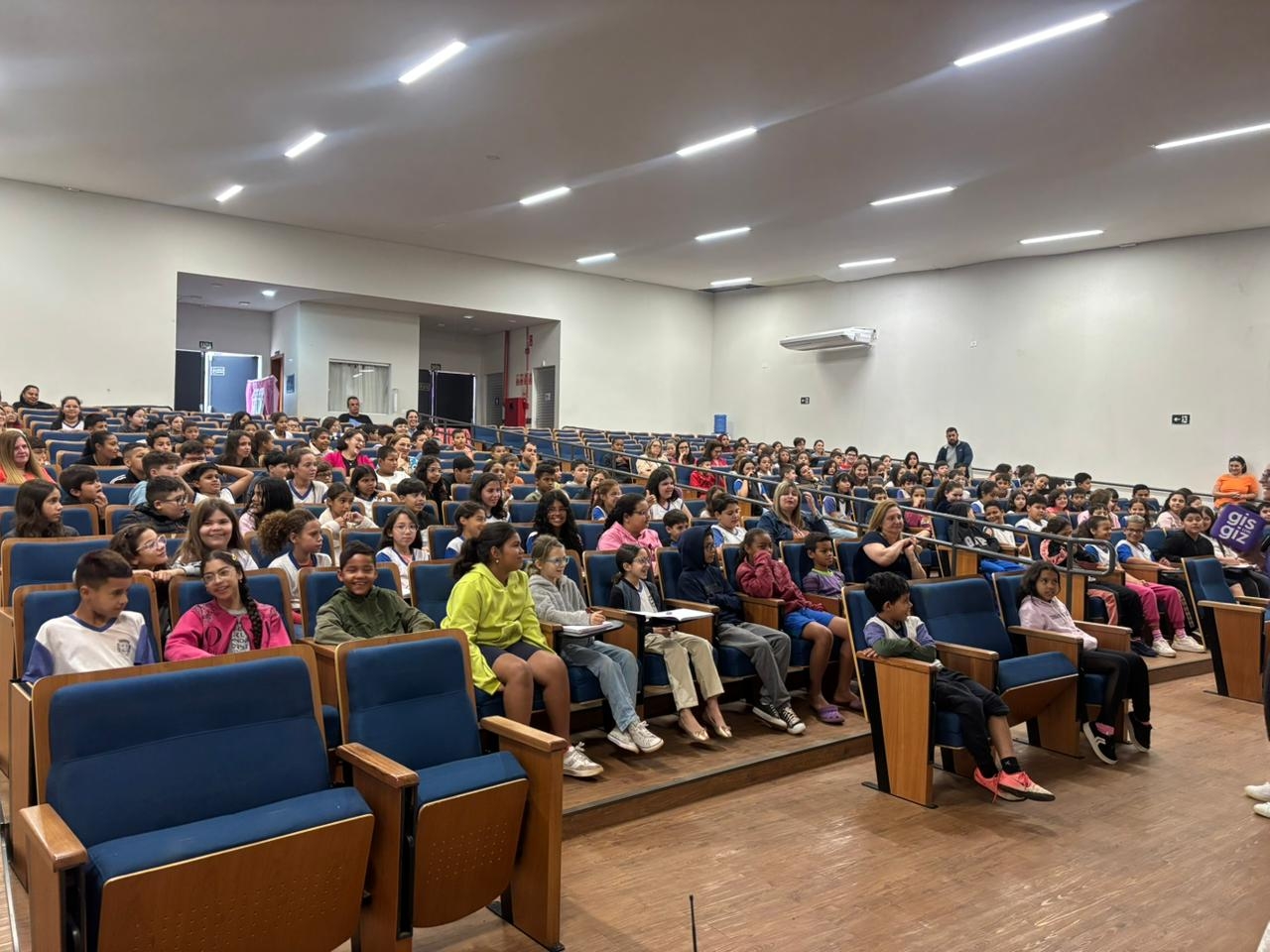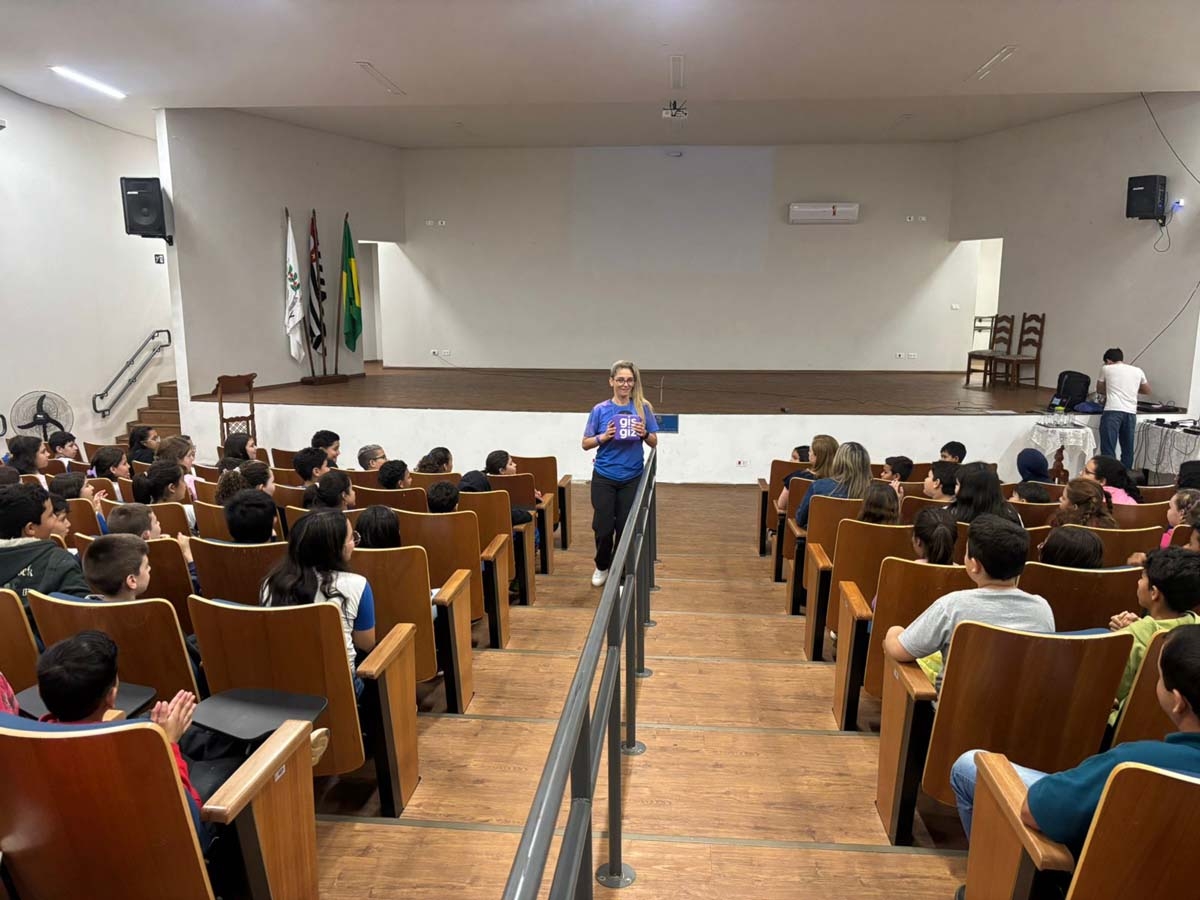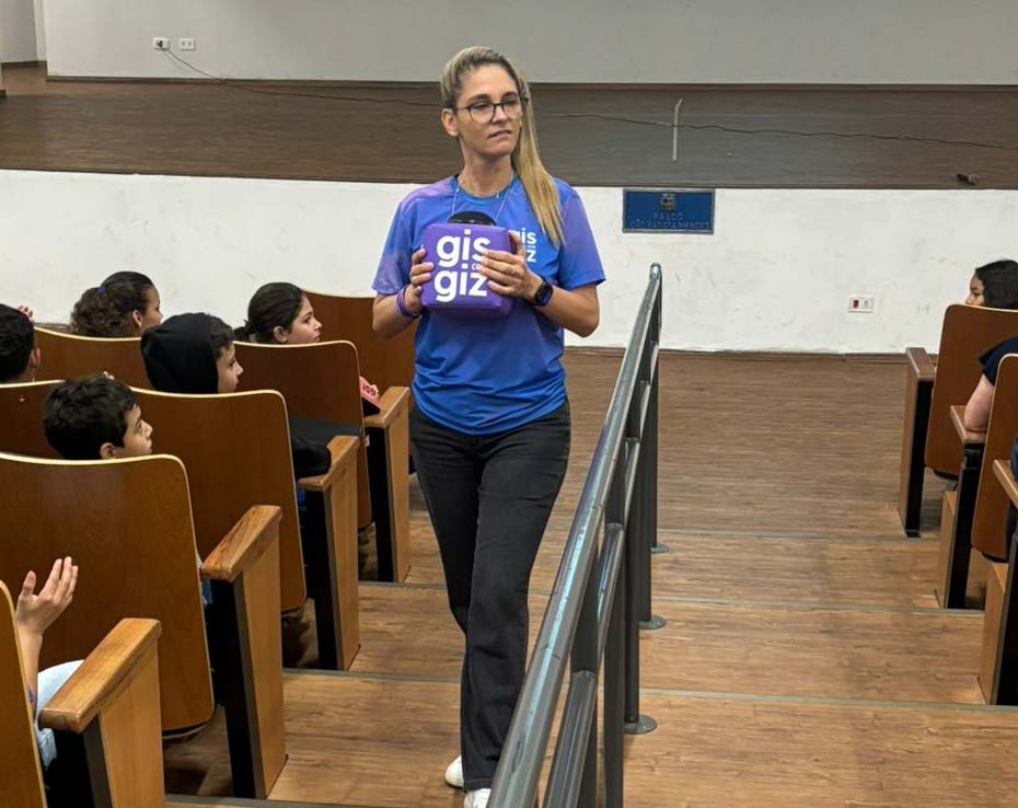Na última quarta-feira (2), a professora e youtuber Gis com Giz, ministrou um aulão especial do Saeb para os alunos do 5º ano na EMEF Professor Miguel de Góes Vieira, em Fartura.