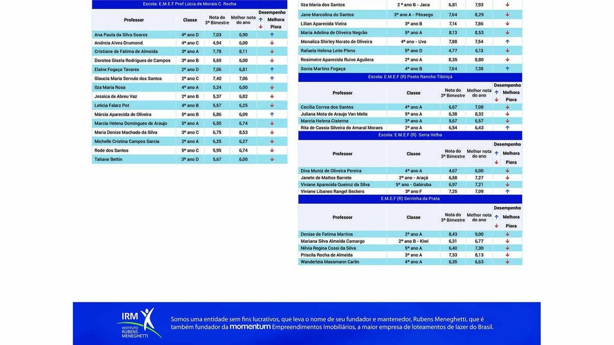 Criado em 2002, o Instituto Rubens Meneghetti (IRM) é uma entidade sem fins lucrativos, que leva o nome do seu fundador e mantenedor. Rubens Meneghetti, que também é fundador da Momentum Empreendimentos Imobiliários, a maior empresa de loteamentos de lazer do Brasil. O IRM promove ações para melhorar a qualidade do ensino da rede pública nas cidades onde estão situados os em-preendimentos administrados pela Momentum: Aguas de Santa Bárbara, Arandu, Irai. Quadra, Pa-ranapanema, Pardinho e Porangaba. Como funciona o PPE? A cada bimestre escolar. os alunos do l° ao 5° ano do ensino fundamental fazem uma avaliação de matemática. Como prémio, as turmas campeãs de cada bimestre recebem medalhas, um troféu e um dia de lazer em um dos clubes localizados nos empreendimentos adminis-trados pela Momentum: Riviera de Santa Cristina, Ninho Verde Eco Residence, Santa Bárbara Resort Residence e Terras de Santa Cristina.