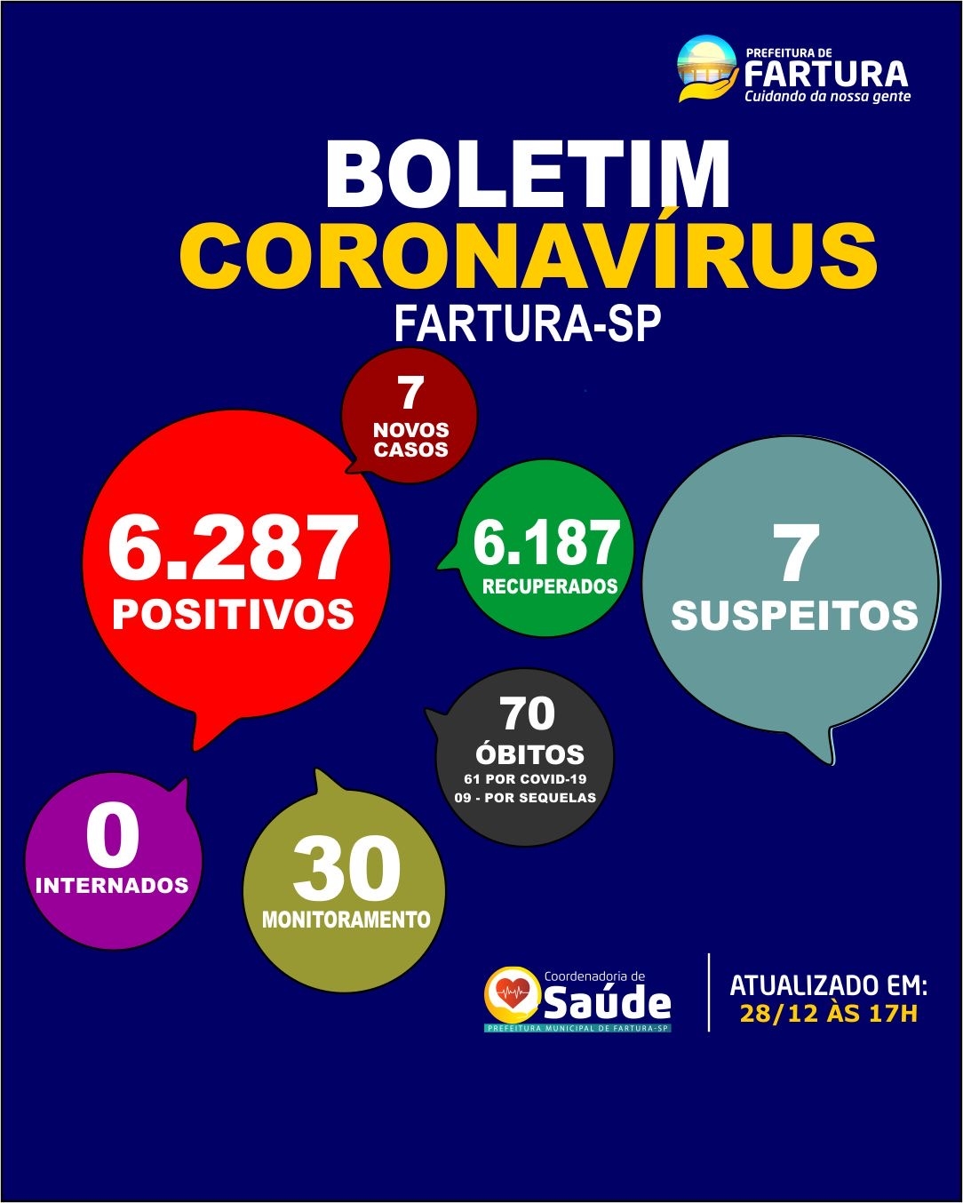 A Coordenadoria de Saúde de Fartura informou nesta quarta-feira, 28/12, outros 7 casos positivos de Covid-19. A Pasta informa que os pacientes com suspeitas da doença devem procurar atendimento no Centro de Saúde Dr. Alécio Ravanelli, de segunda a sexta-feira, das 13h às 16h. O acesso é pela Rua Artur de Andrade.