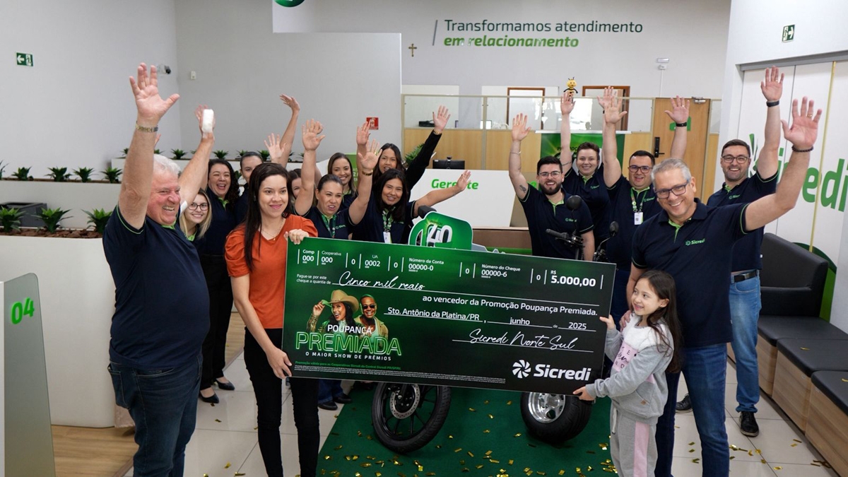 A sorte voltou a sorrir para a Sicredi Norte Sul! A cooperativa acaba de registrar seu 6º ganhador na promoção Poupança Premiada Sicredi, que tem sorteios semanais de R$ 5 mil e prêmios maiores ao longo do ano. Desta vez, a contemplada foi uma associada de Santo Antônio da Platina, no Paraná, que recebeu a premiação simbólica na própria agência, com a presença dos colaboradores e do presidente da cooperativa.