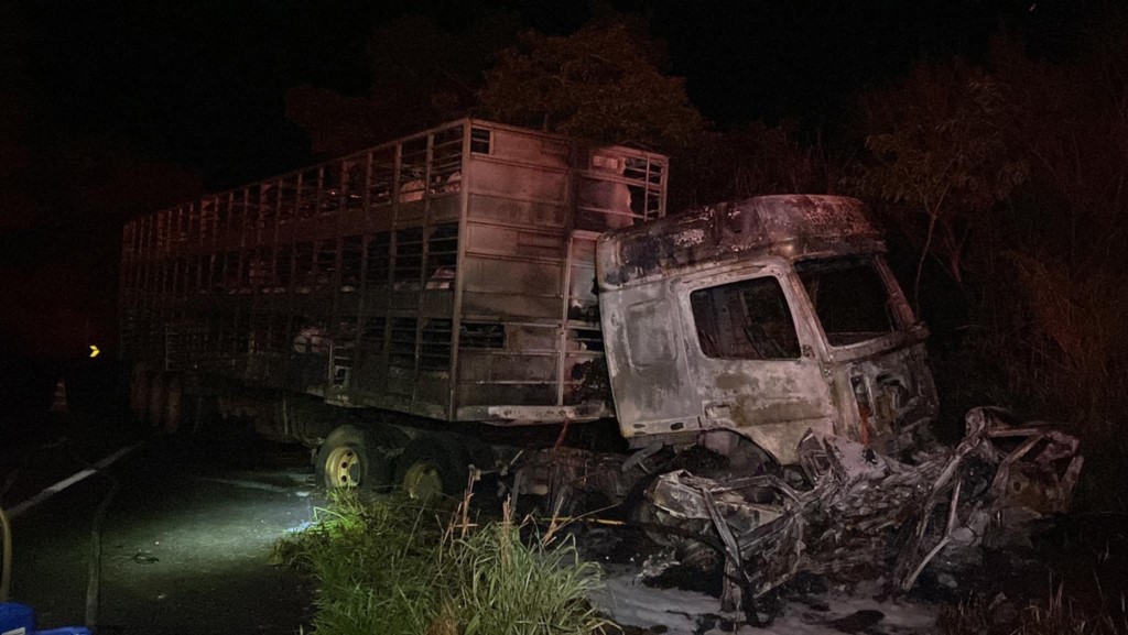 De acordo com o Corpo de Bombeiros, a pessoa estava dirigindo um carro com placas de Sarutaiá, que não foi identificada, invadiu a pista contrária e bateu de frente com a carreta que transportava porcos e foi arrastado por cerca de 200 metros e pegou fogo.