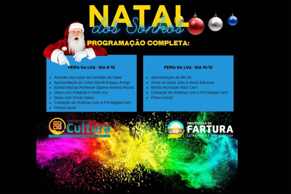 O Natal dos Sonhos promete emocionar os farturenses e hoje, quinta-feira, 8/12, a Prefeitura convida a todos para prestigiarem o grande momento de acender as luzes dos enfeites instalados na Praça de Julho, a partir das 18h. Fartura viverá o verdadeiro clima do espírito natalino.