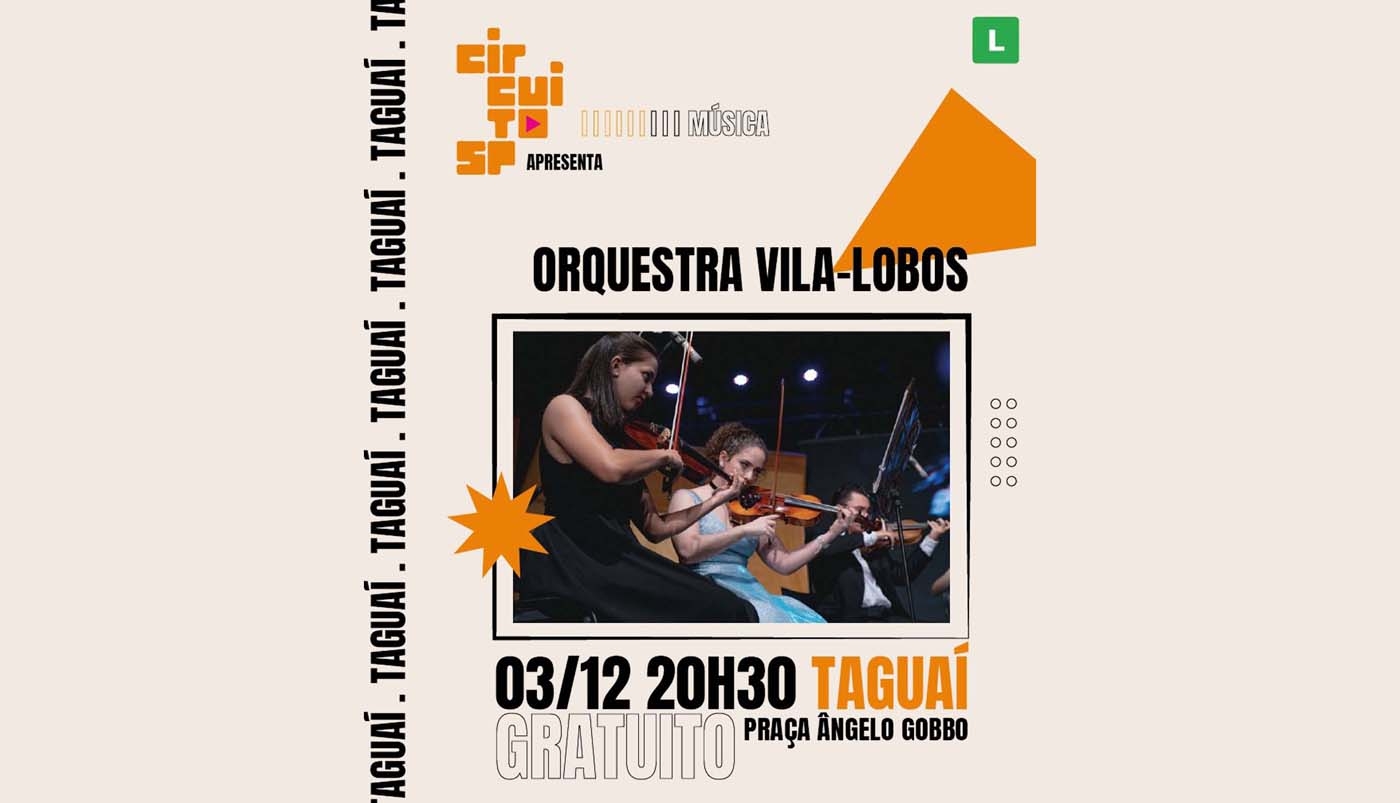 No próximo sábado, 3 de dezembro, Taguaí irá receber a Orquestra de Câmara Villa Lobos da cidade de Votuporanga. A 3ª atração em parceria com o Circuito SP e Amigos da Arte acontecerá na Praça Ângelo Gobbo, a partir das 20:30.