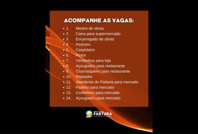A equipe da Coordenadoria de Indústria, Comércio e Emprego, de Fartura, divulgou por meio do Posto de Atendimento ao Trabalhador (PAT), que há inúmeras 28 vagas de trabalho disponíveis. Interessados levar currículo no PAT: Rua Luiz Ribeiro Salgado, 20. Contato pelo telefone/WhatsApp (14) 3382-2035.